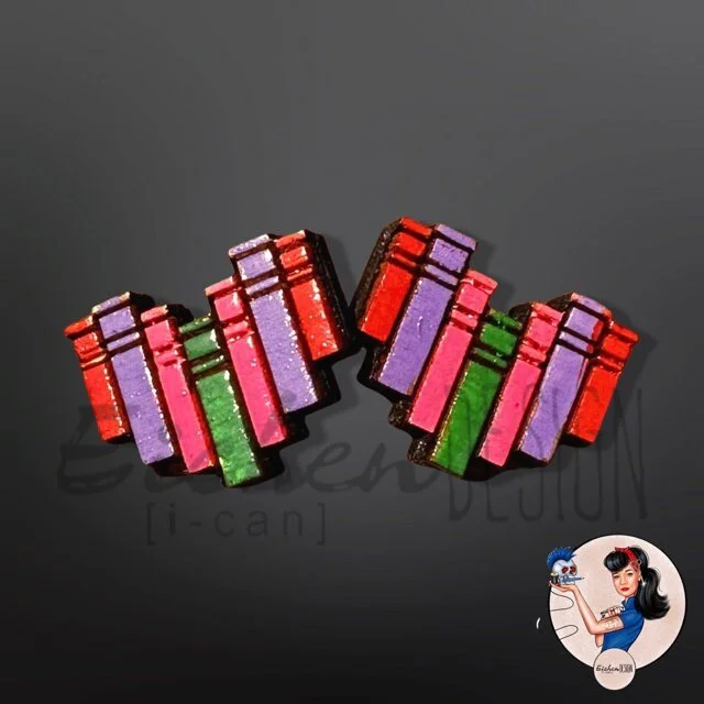 Custom wood cut, painted and sealed earrings, perfect to be worn as cute bookish charms. All earrings are made with hypoallergenic and nickel free posts.