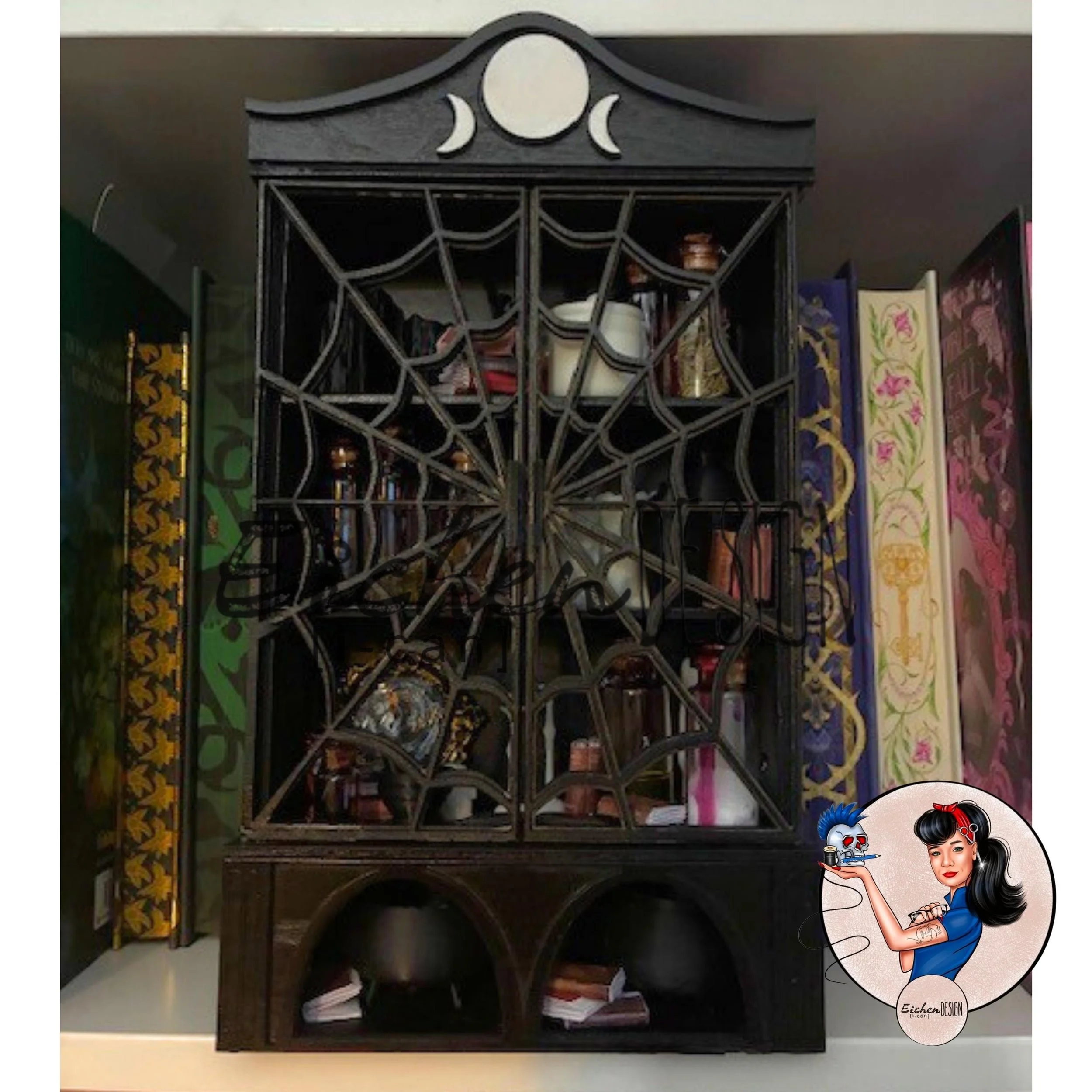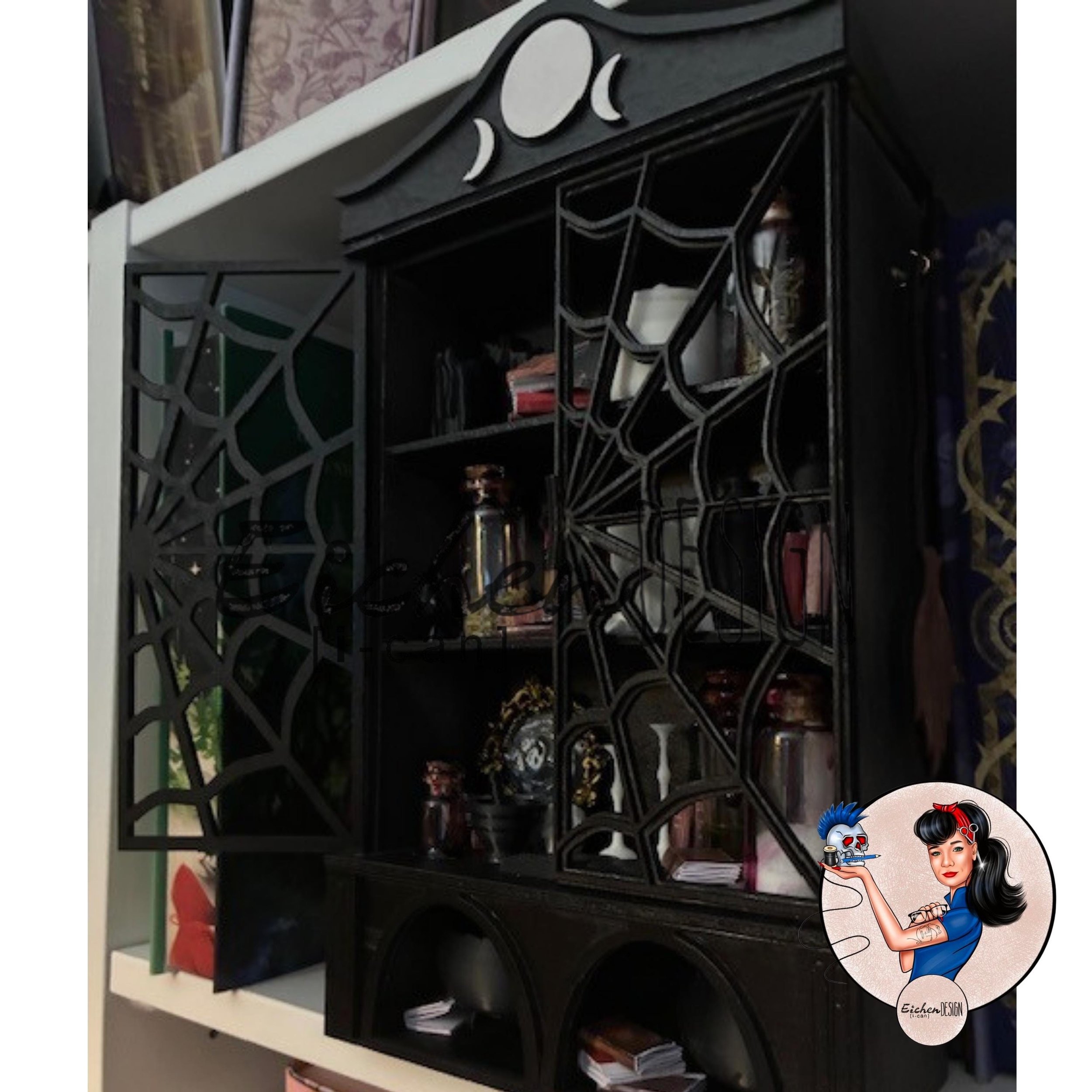 This mini handmade witches cabinet comes completely assembled and ready to add to your decor! Cabinet and accessories are made from wood, resin, PLA and acrylic, paper and glass. I build every item on this shelf, with the exception of the crow and the glass jars. Please see the pictures for scaling, as this is a miniature (hence the cuteness)! This shelf measures approximately 9 inches tall and stands on its own on your bookcase or shelf. It also has a false back for you to keep things hidden. Because a witch must have her secrets, right?
