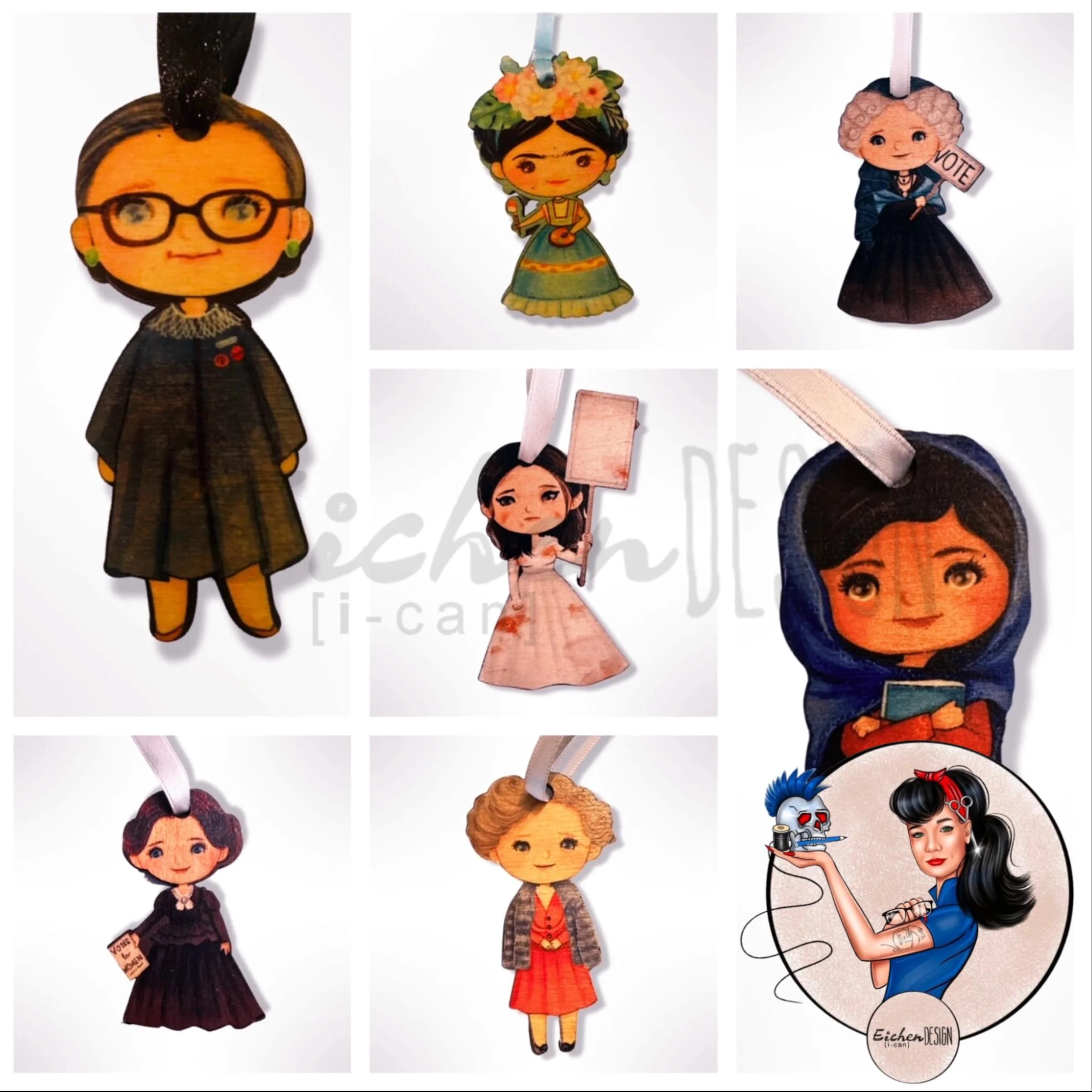 Bookmark or Ornament Set - Womens Rights Activists - Wooden RBG Li Ting Ting Susan B Anthony Malala Stanton Frida Eleanor Roosevelt